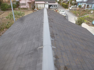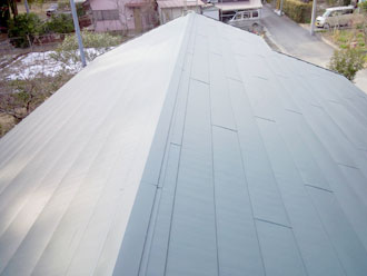 既存屋根材とは色の差異がありますが、しっかり屋根葺き替え工事を行い雨漏りを防ぐ事が出来ました。