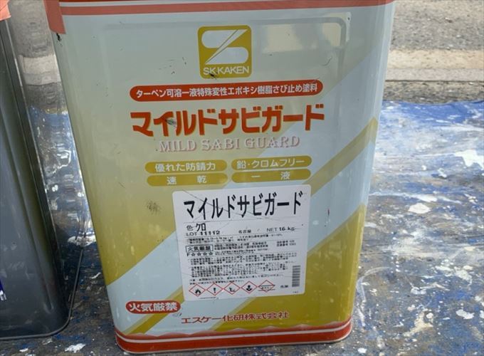 鉄部への塗装となりますので下塗り材は、エスケー化研のマイルドザビガードを使用します。こちらの塗料は錆止め塗料とも呼ばれ錆の発生を防いでくれる役割があるのと、下地と上塗り塗料の接着性を高めてくれます。また、乾燥時間が3時間と速乾性があり作業効率を向上させる事が可能です。
