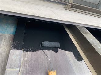 上塗りの様子になります。中塗りの上にもう一層塗膜を重ねる工程となります。仕上げ塗料は2回以上塗り重ねる事が基本となりますので塗装工事を行う際には、業者の方に塗装回数の確認や作業工程を写真に記録し必要な回数の塗装が行われているかを確認するとより安心です。