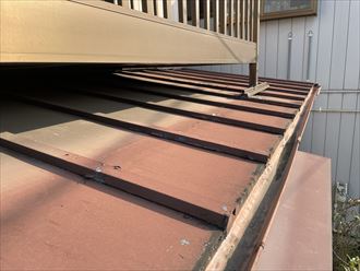 今回施工を行う屋根にはベランダが乗っている為ベランダ下のスペースが狭く、そのままの状態では塗装作業が困難な状態でした。ですので、ベランダ床面の取り外しを行い塗装可能なスペースの確保を行いました。
