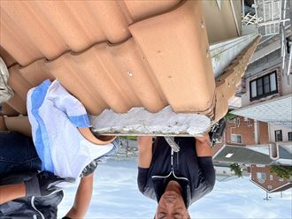 瓦がズレているのは、屋根の袖に設置されているケラバ瓦の固定力が経年劣化によって低下したことで、ズレてしまっています。ケラバ瓦は、瓦内に貫板が設置されており、貫板が劣化によって釘の固定が弱まり事でズレが起きてしまいます。現状のズレを改善するには、瓦を取り外し内部の貫板を交換し取り付けし直す工事が必要です。お客様に改善するための工事をご説明し、工事のご依頼をいただき工事を行わせていただきました。