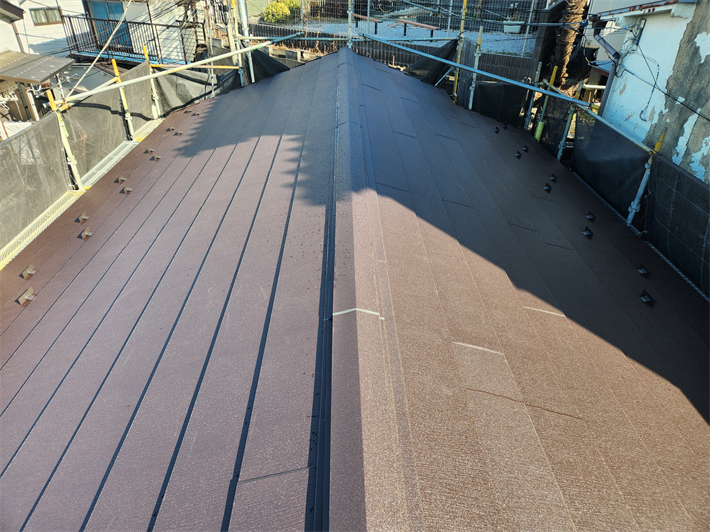 上記で記した調査報告を行ったところ、塗装でのメンテナンスをご希望されました。屋根は常に紫外線や雨風に晒される為、劣化が早い部分になりますので耐久性の高いフッ素塗料にて工事のご提案を行いました。