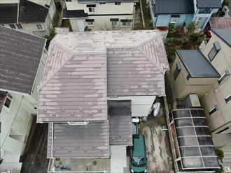 屋根には太陽光パネルが16枚乗っておりスレート瓦全体のの状態が悪いこともあり、部分補修して塗装工事の方法もありますが、定期的にメンテナンスをしないといけないランニングコストを考えると、今後のことを考え今回はカバー工事のご提案となりました。