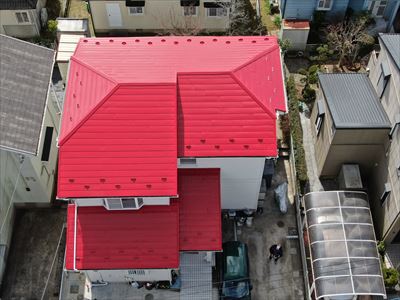 屋根カバー工事が完了しました。この工法は屋根葺き替え工事と比べて工程が少なく、効率的な方法です。ディートレーディングディプロマットスターを使用したカバー工法が完了します。
