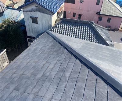 ●スレート屋根の屋根修理には屋根材のひび割れのコーキング補修や棟板金補修や交換などがあります。
